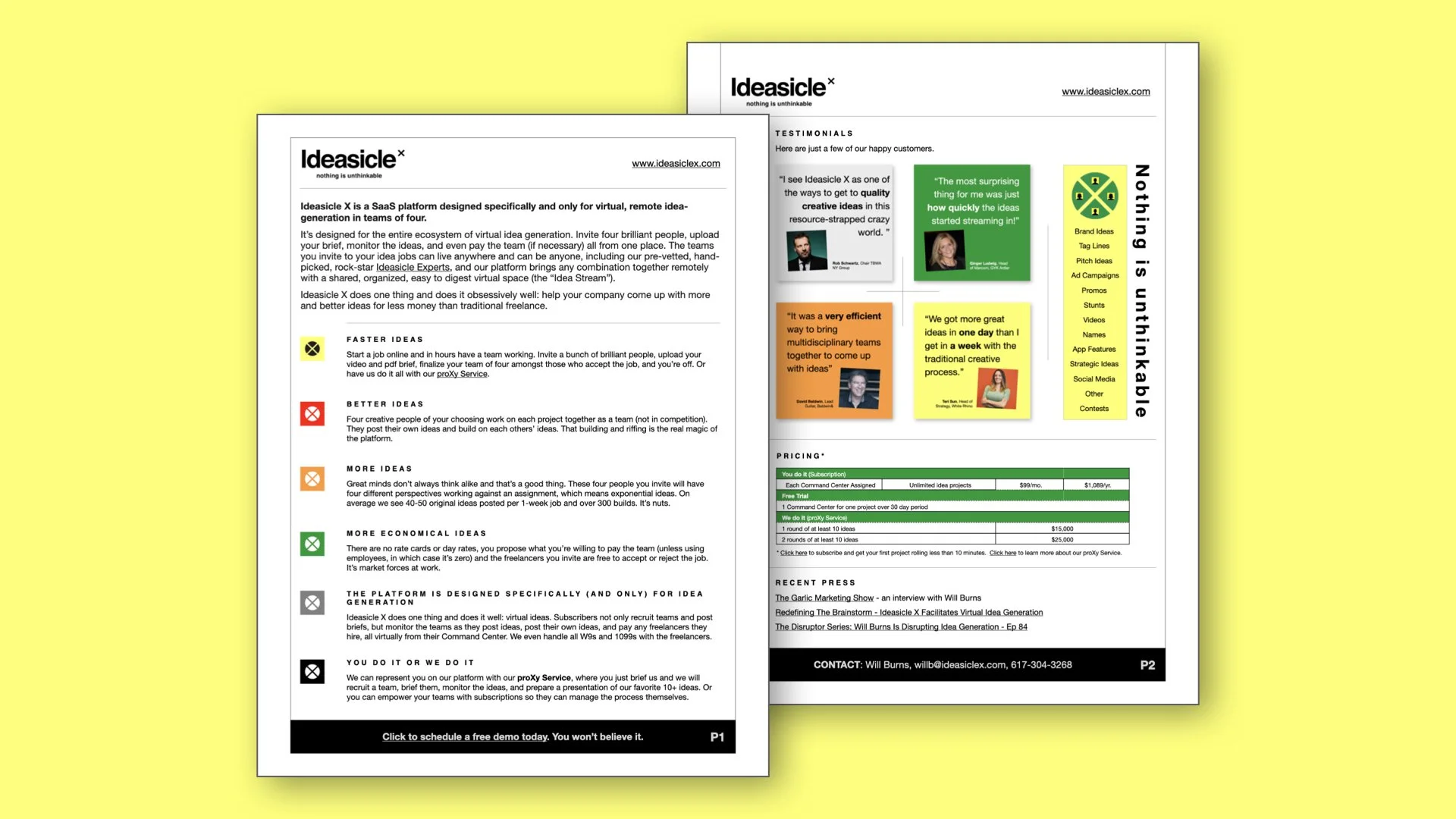 Onboarding Zoom: a one-hour session with our CEO, Will Burns, to give you a detailed overview of the Ideasicle X model and our messaging. He will also make himself available for any questions you have along the way.