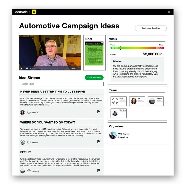 Ideasicle X is a virtual idea-generation platform where a customer (an ad agency, say) recruits 4 creative people to form a team and come up with ideas together. All four members of this team may be living in different cities, but they are brought together on this platform to do nothing but come up with ideas. No meetings, no presentations, no politics, no hotels, no travel, just ideas from your computer, your tablet and/or your smartphone when those ideas hit you. And, if it’s a paid project, you’ll get paid after the project is over right from the platform when you link your profile to your bank account via Stripe (employees do not need to do this step since you’re already getting paid by your employer).