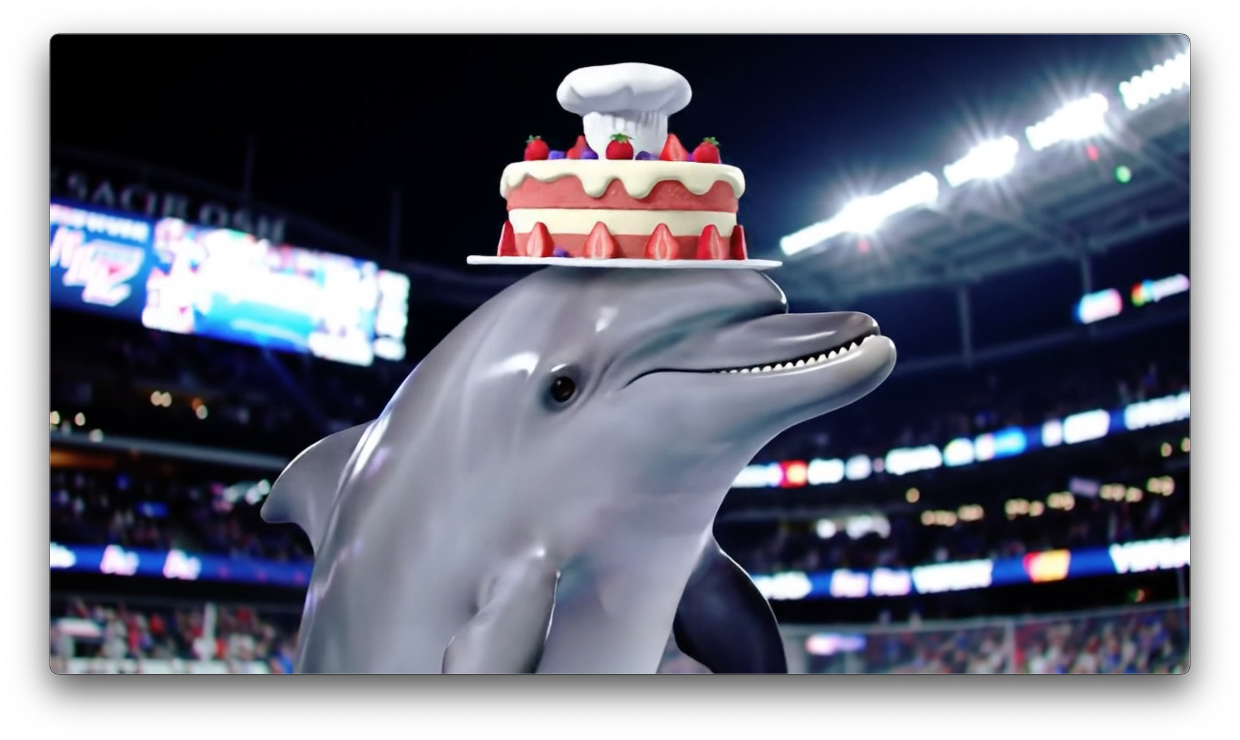 Admittedly not the latest and greatest in AI video generation, but it still makes the point. There is no actual singing and there are no New York Rangers, but it’s pretty clearly some sort of sports stadium. And definitely a dolphin singing something with a cake on its head (and a hat on top of that the AI decided to add). Is that close enough creatively? That’s up to you.